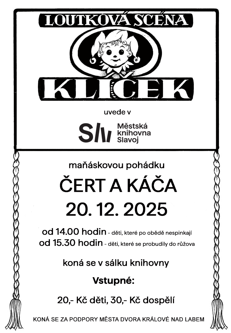 Maňásková pohádka pro děti. Koná se v sálku knihovny. Vstupné 20,- Kč děti, 30,- Kč dospělí.