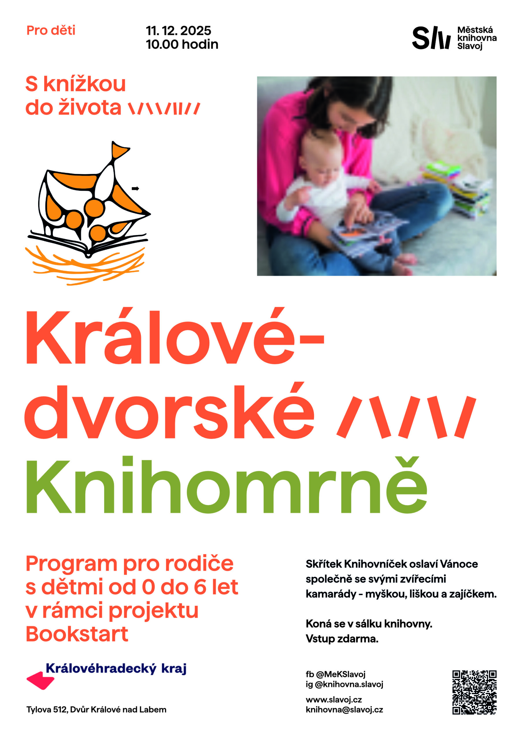 S knížkou do života – Bookstart. Skřítek Knihovníček oslaví Vánoce společně se svými zvířecími kamarády – myškou, liškou a zajíčkem. Koná se v sálku knihovny. Vstup zdarma.