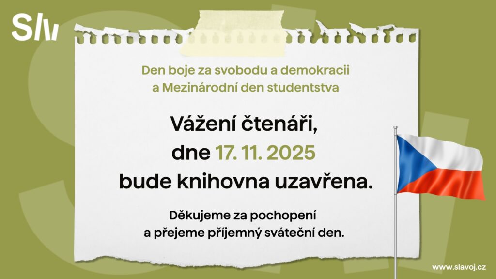 Vážení čtenáři a návštěvníci knihovny, přejeme vám příjemný sváteční den v pondělí 17. 11. 2025. Rádi bychom vás informovali, že v tento den bude naše knihovna uzavřena.